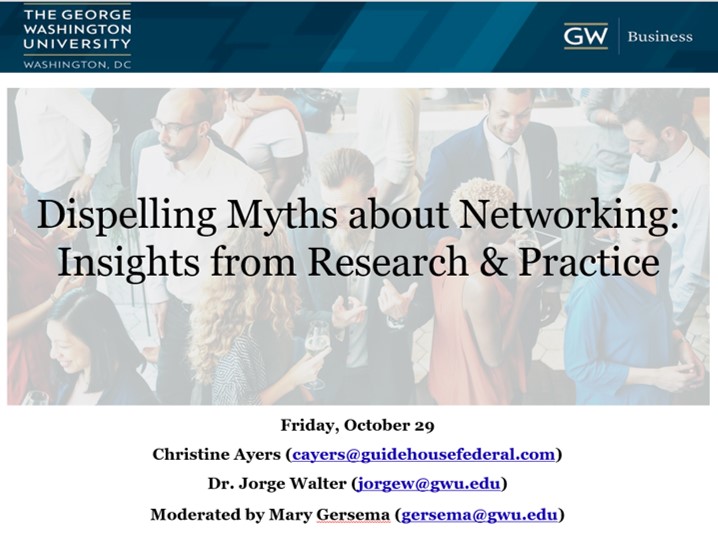 Excited to be part of our next Graduate Student Meet & Greet at the George Washington University School of Business. At this event series, panels of graduate students, alumni, faculty and staff listen to a topical conversation between GWSB alumni and faculty scholars and then reflect on the discussion in small break out groups. This event’s conversation topic is “Dispelling Myths About Strategic Networking: Evidence from Theory and Practice,“ and I am teaming up with Christine Ayers, who is a partner and account leader in Guidehouse.
